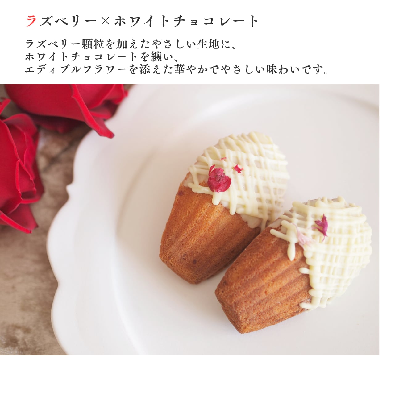 ラズベリー顆粒を加えたやさしい生地は、ホワイトチョコレートでコーティングされ、エディブルフラワーが華やかさを添えています。一方、ココア生地にオレンジピールを混ぜ込み、カカオと柑橘の香りが広がる、まさに大人のためのマドレーヌです。開封した瞬間、芳醇な香りがふわっと広がり、至福のひとときを演出します。