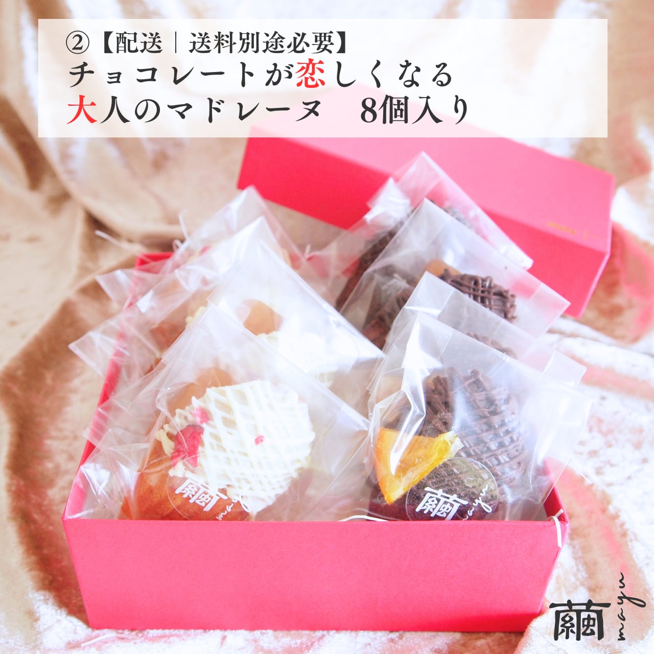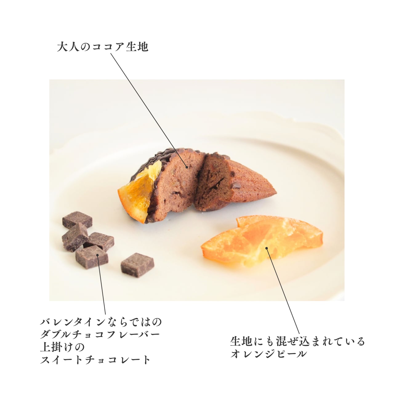 ラズベリー顆粒を加えたやさしい生地は、ホワイトチョコレートでコーティングされ、エディブルフラワーが華やかさを添えています。一方、ココア生地にオレンジピールを混ぜ込み、カカオと柑橘の香りが広がる、まさに大人のためのマドレーヌです。開封した瞬間、芳醇な香りがふわっと広がり、至福のひとときを演出します。