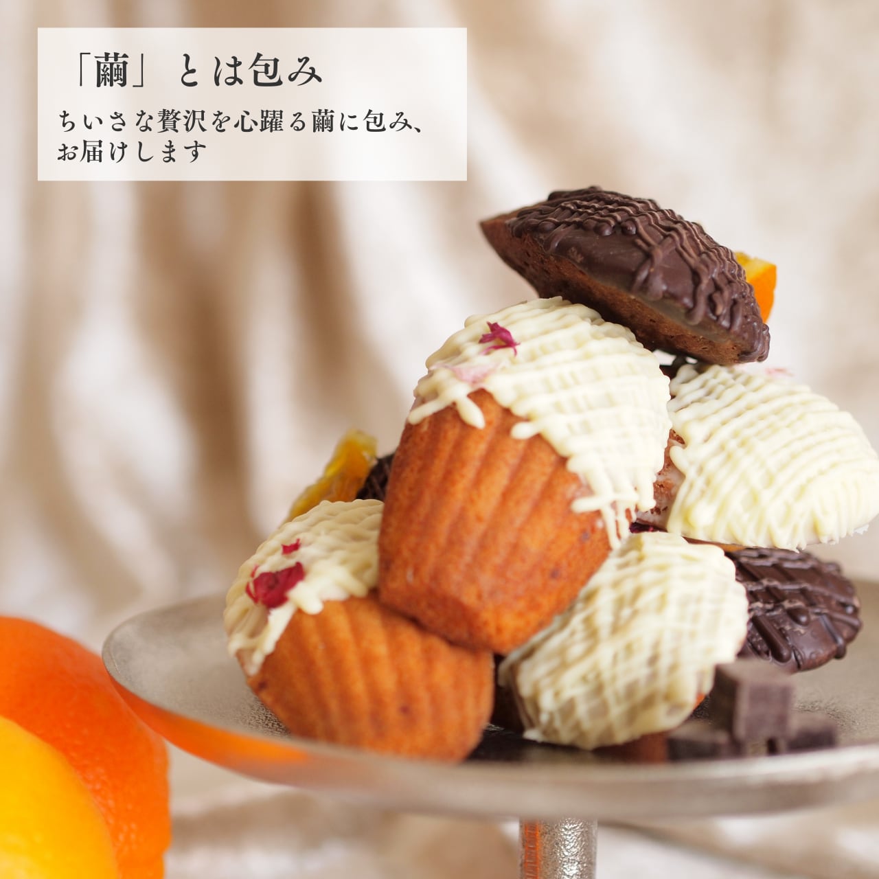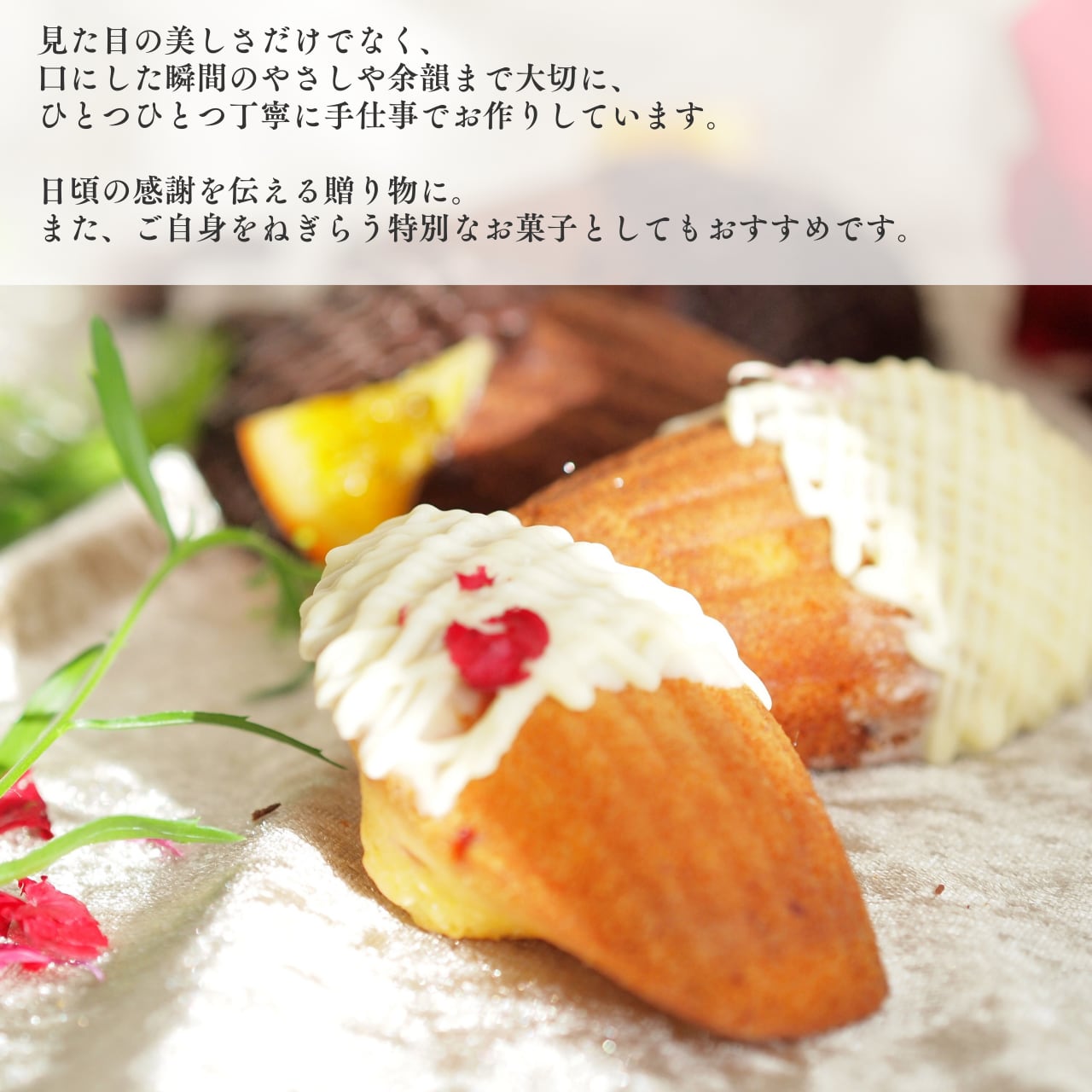 ラズベリー顆粒を加えたやさしい生地は、ホワイトチョコレートでコーティングされ、エディブルフラワーが華やかさを添えています。一方、ココア生地にオレンジピールを混ぜ込み、カカオと柑橘の香りが広がる、まさに大人のためのマドレーヌです。開封した瞬間、芳醇な香りがふわっと広がり、至福のひとときを演出します。