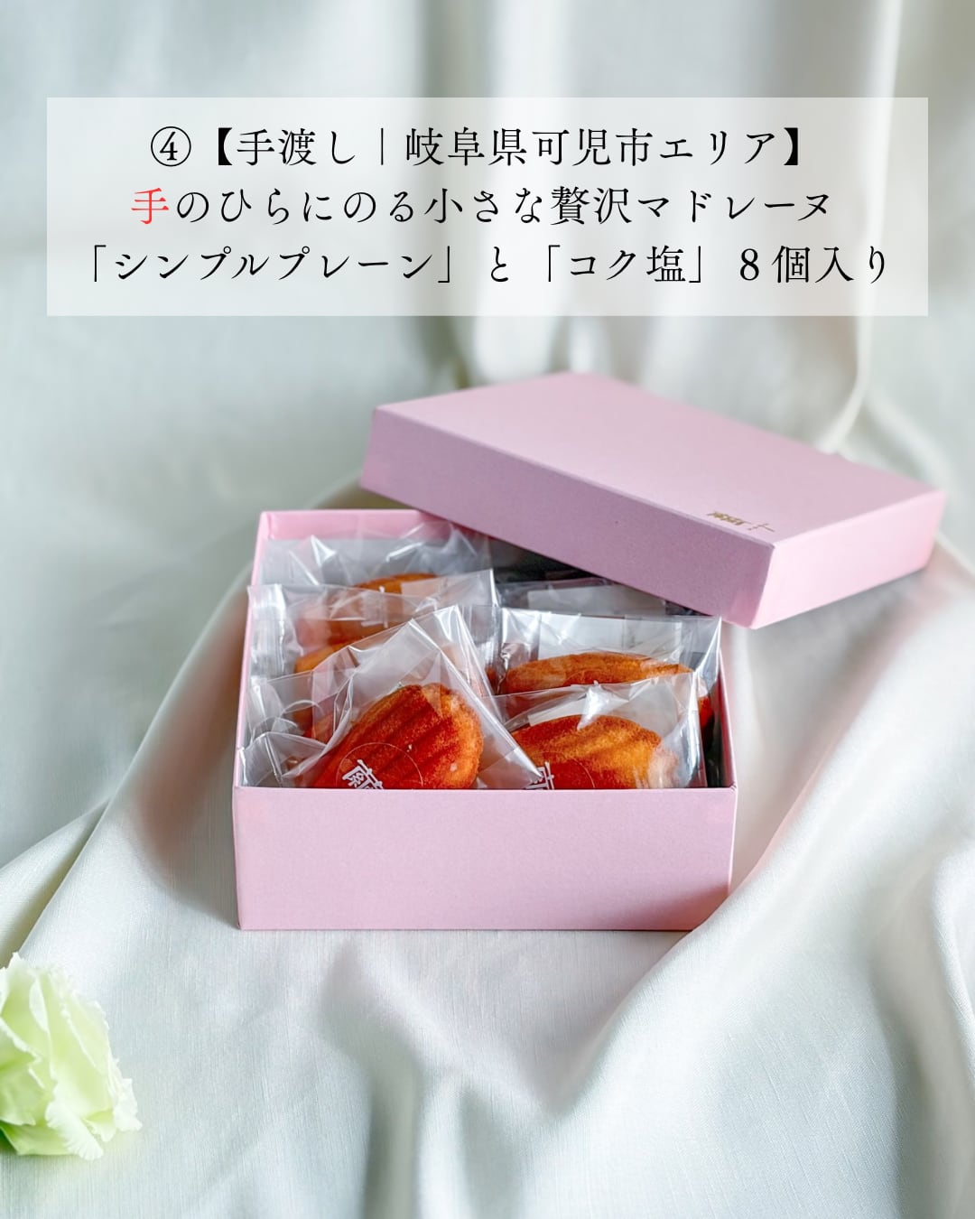 その小さなサイズは、心を込めた贈り物や特別なおやつタイムにぴったりです。特別なパッケージに包まれたマドレーヌは、大切な方への感謝の気持ちやお祝いの想いをしっかりと表現します。やわらかな時間を楽しむひとときを、ぜひこのマドレーヌでじっくり味わってみてください!