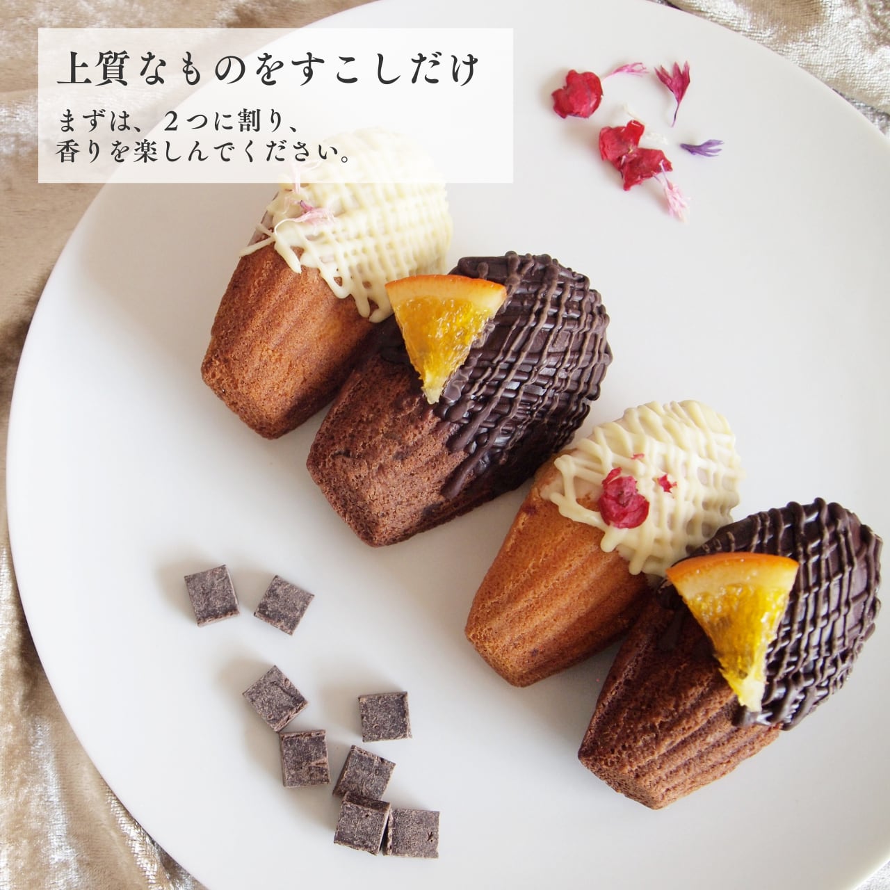 ラズベリー顆粒を加えたやさしい生地は、ホワイトチョコレートでコーティングされ、エディブルフラワーが華やかさを添えています。一方、ココア生地にオレンジピールを混ぜ込み、カカオと柑橘の香りが広がる、まさに大人のためのマドレーヌです。開封した瞬間、芳醇な香りがふわっと広がり、至福のひとときを演出します。