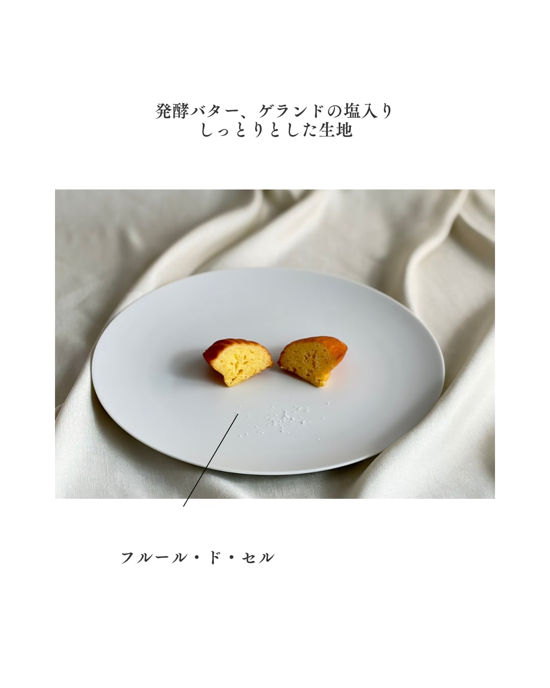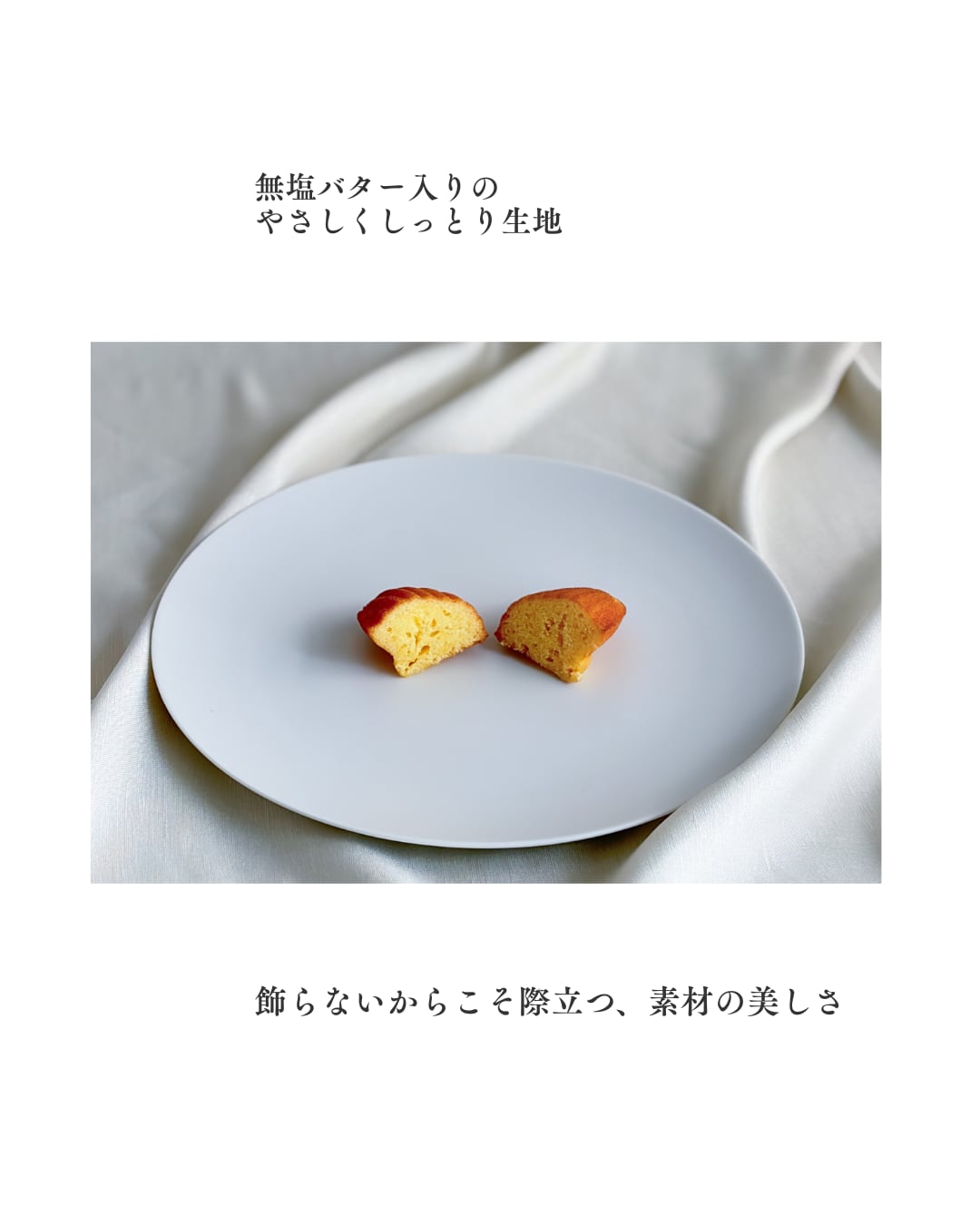 プレーンと塩の2種類が楽しめるこのマドレーヌは、ふんわりとした生地とともに、豊かな風味が織り交ぜられています。しっとり感と軽やかな口当たりが心地よく、どちらの味も一口ごとにやさしい余韻を残します。